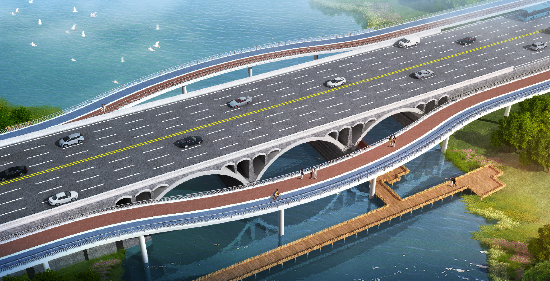 萊蕪區(qū)月波湖橋改造工程,老橋慢行空間改造為機動車道,實現雙4改雙8 兩側新建2座5跨行橋同步確保新老橋孔慢行過街功能,拼橋選取上玄月及飄帶造型,提升橋梁景觀,同時避讓現狀慢行步道。